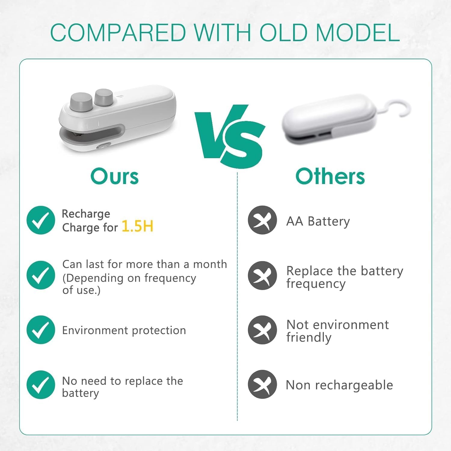 With a built-in 400mAh battery, our rechargeable hot bond bag sealer comes with a micro USB cable (included), so there's no need to buy extra AA batteries. Save your money and protect the environment! 🌿 A full charge supports 7~15 days of use, depending on the frequency.